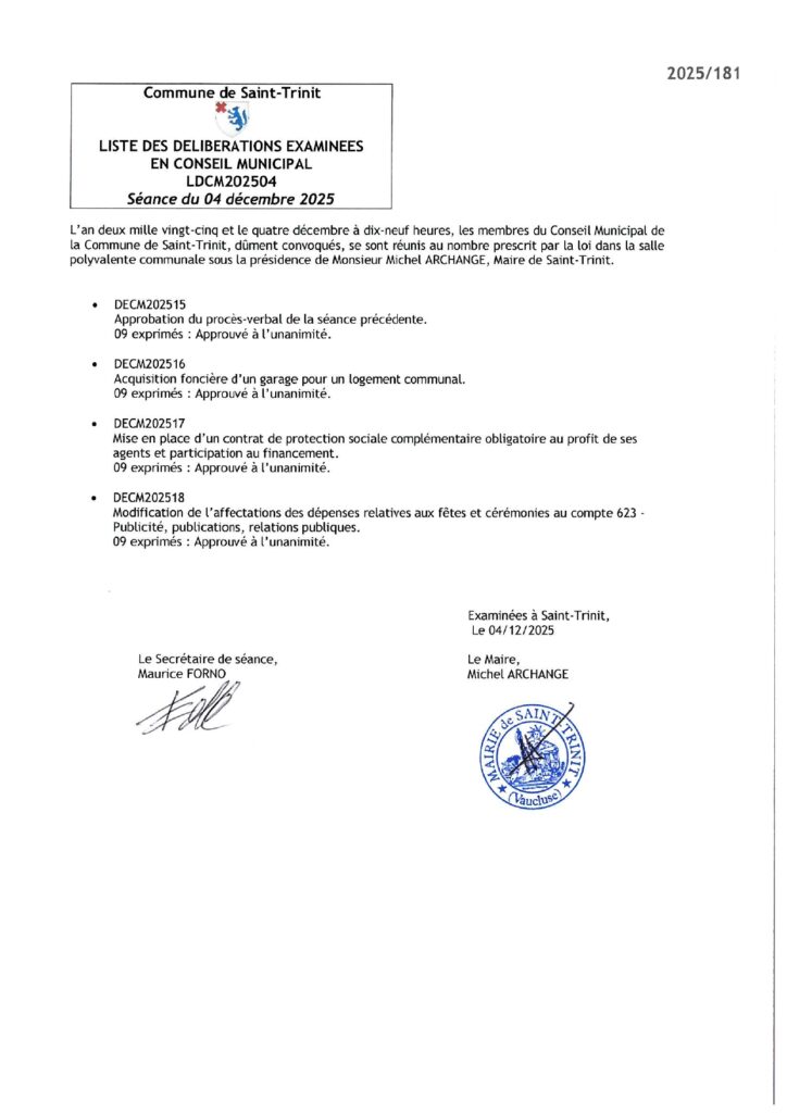 Liste des délibérations examinées au conseil municipal du 04 décembre 2025