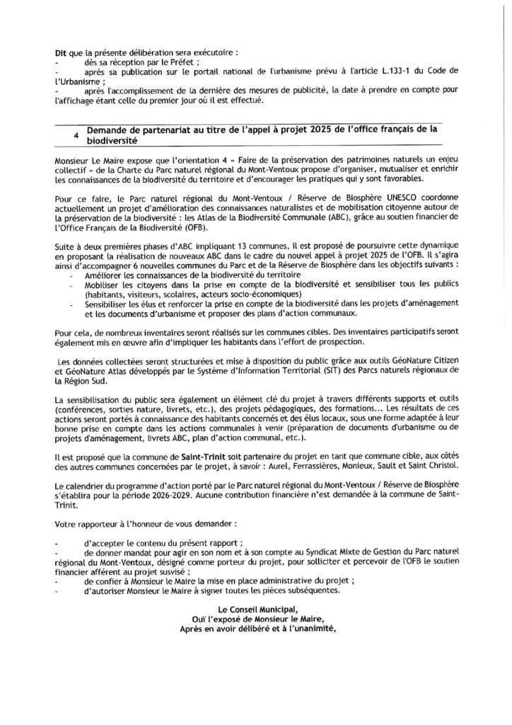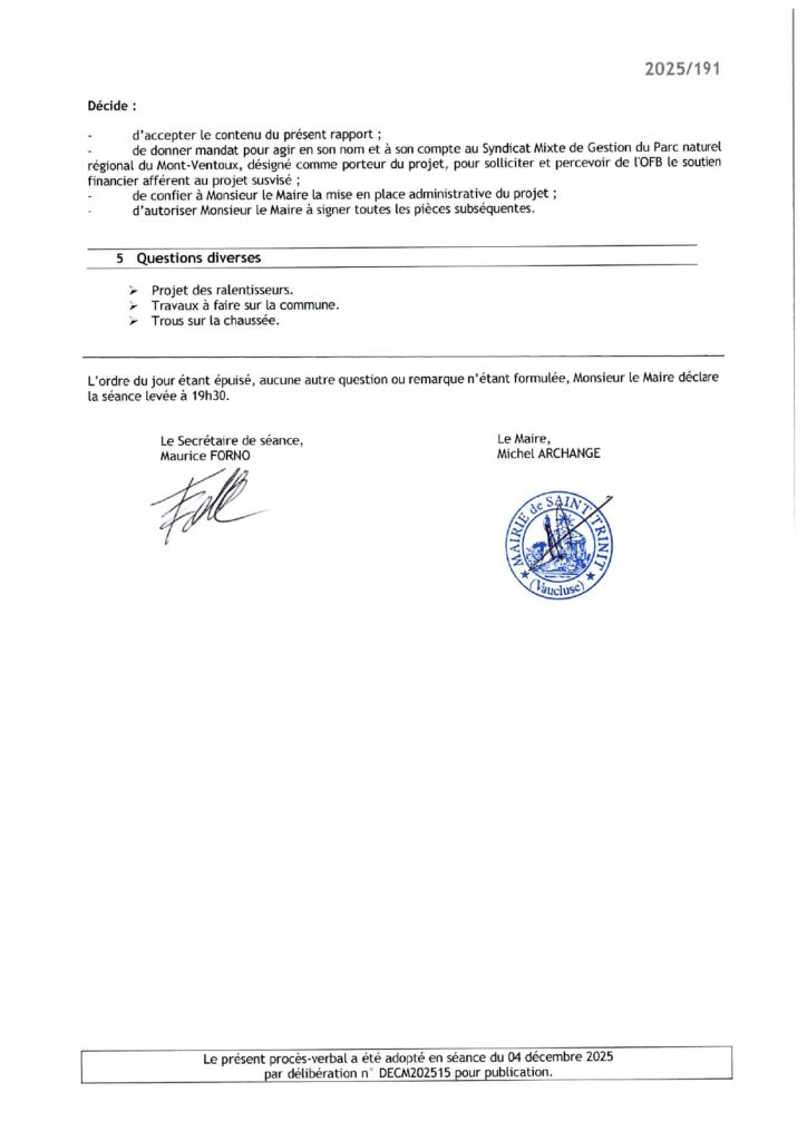 La prochaine séance du conseil municipal aura lieu le jeudi 04 décembre 2025 à 18h30 dans la salle polyvalente communale.